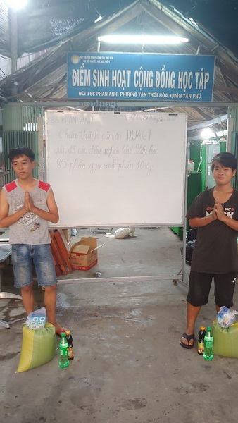 Buổi phát gạo bắt đầu từ 5 giờ chiều tại địa chỉ 166, Phan Anh P. Tân Thới Hòa, Q. Tân Phú - Sài Gòn. Anh chị Đoàn Văn Hùng, phụ trách lớp học, thay mặt DUACT tổ chức thực hiện kéo dài đến hơn 7 giờ tối mới kết thúc do không thể tập trung đông đảo một lúc theo quy định và trở ngại do trời mưa lúc gần cuối.